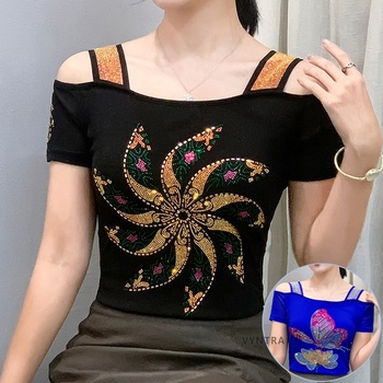 Nouveau design, hauts pour femmes, papillon, strass, épaules dénudées, brillants, paillettes, vêtements, t-shirts, manches courtes, chemises de soirée, t-shirt de fête