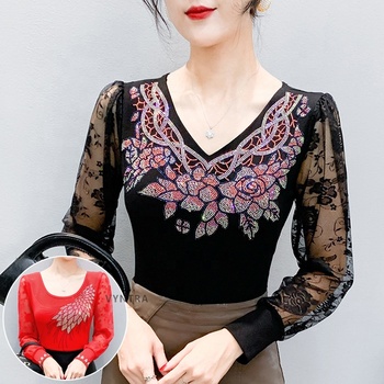 Nuevas tendencias, ropa holgada con lentejuelas brillantes de encaje con diamantes de imitación con estampado Floral para mujer, camisetas de manga larga para discoteca, camiseta de fiesta